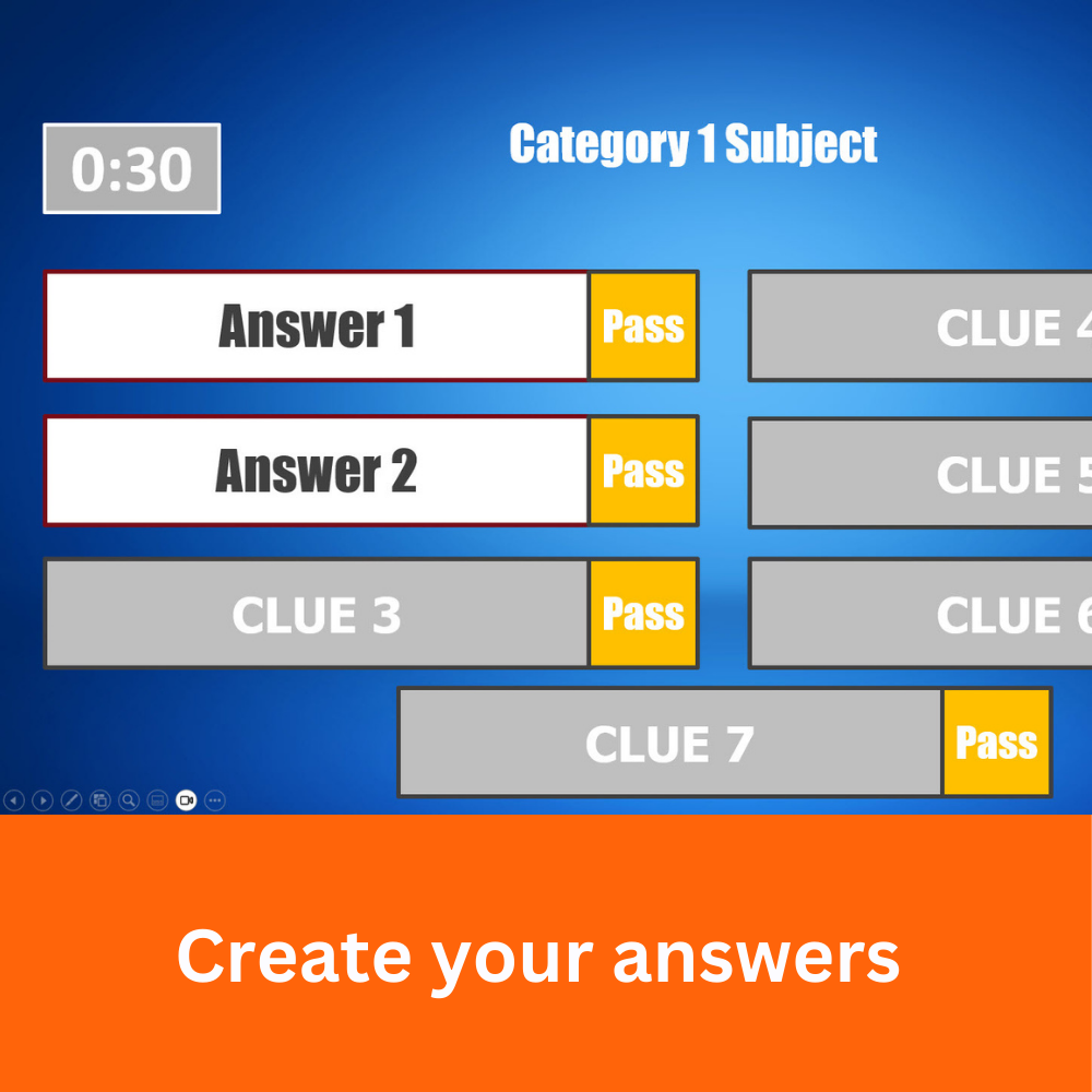 - Fully Customizable – Write your own categories and clues to match any topic, subject, or training objective