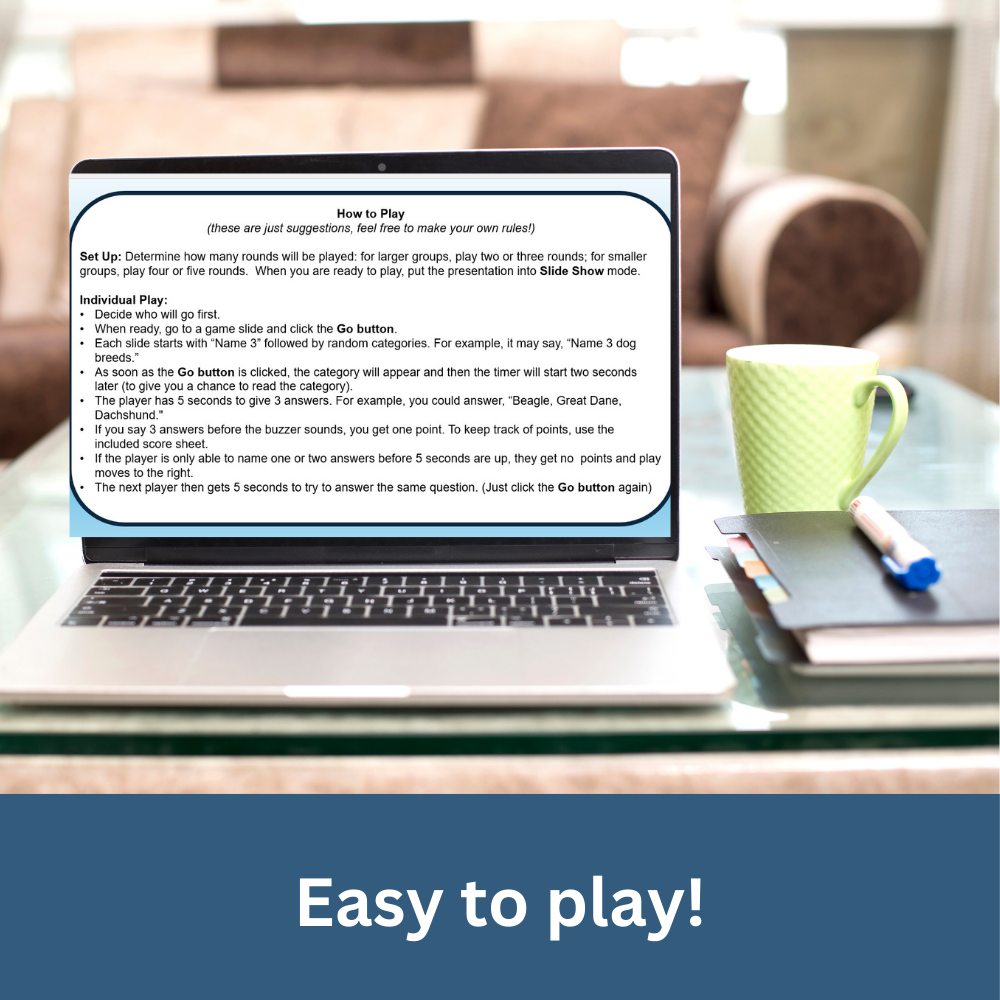 With this template, you can add your own categories and questions while keeping the original game’s exciting five-second countdown. It’s easy to set up and fun for everyone, no matter the occasion!