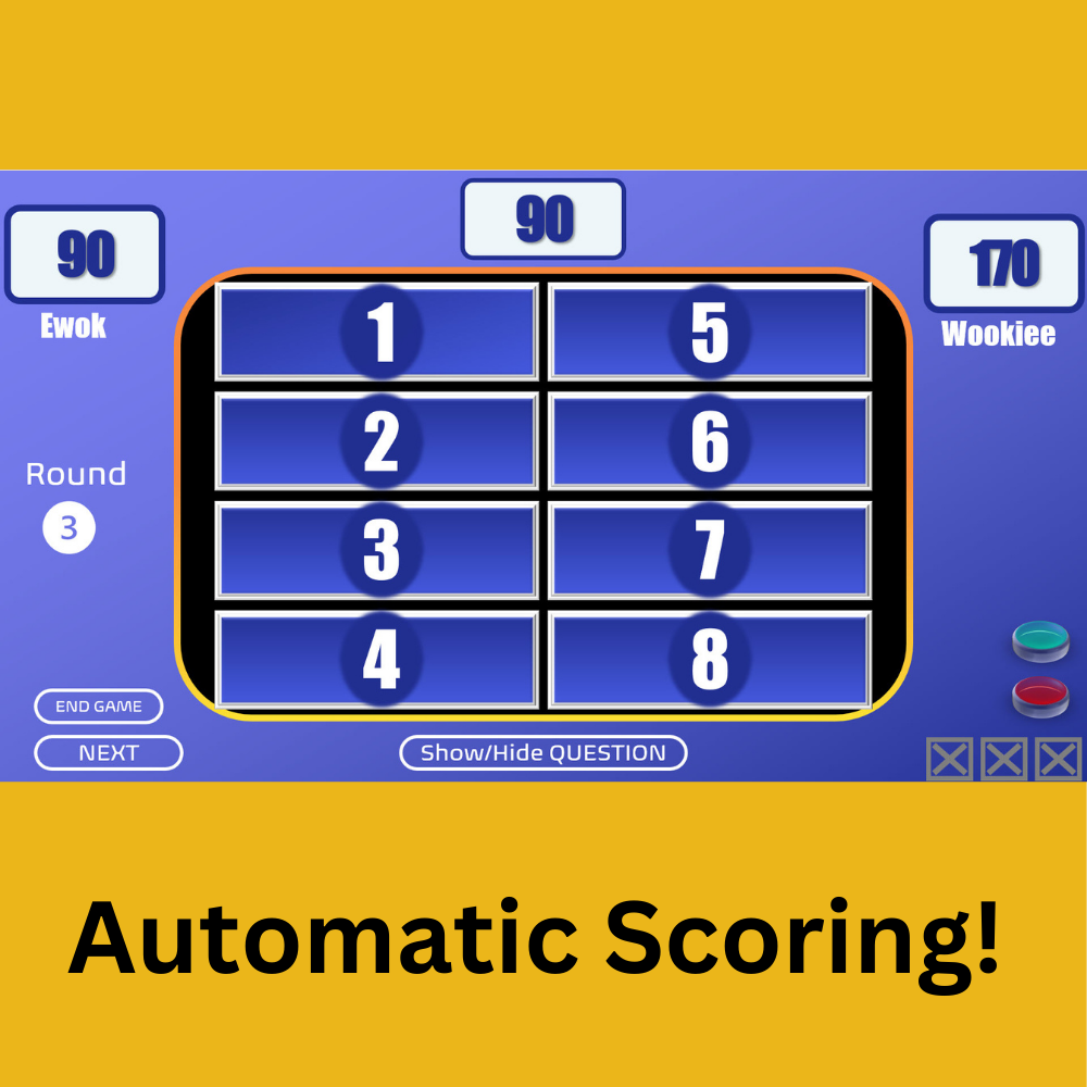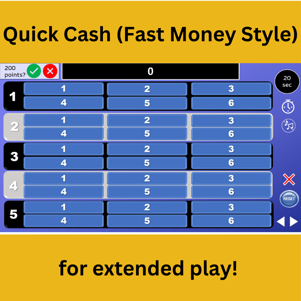 - Macro-enabled PowerPoint game with customizable rounds + Quick Cash rounds