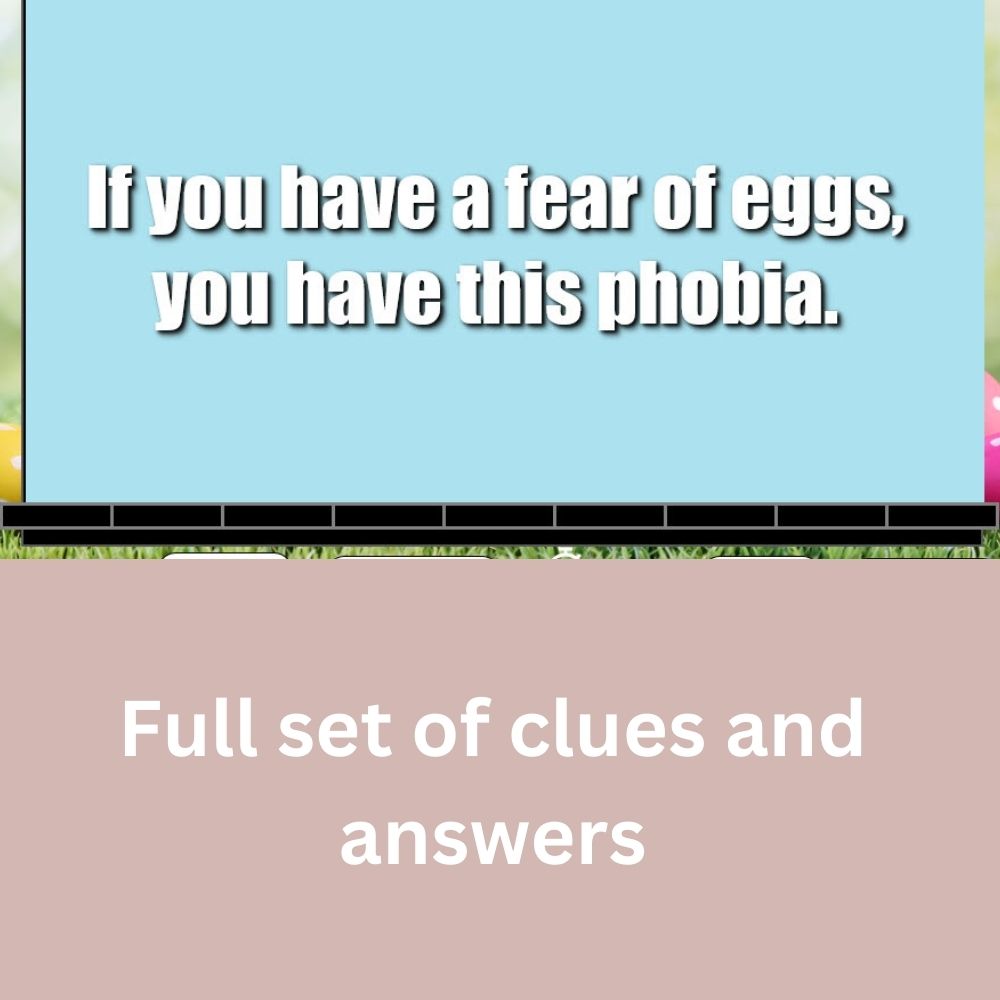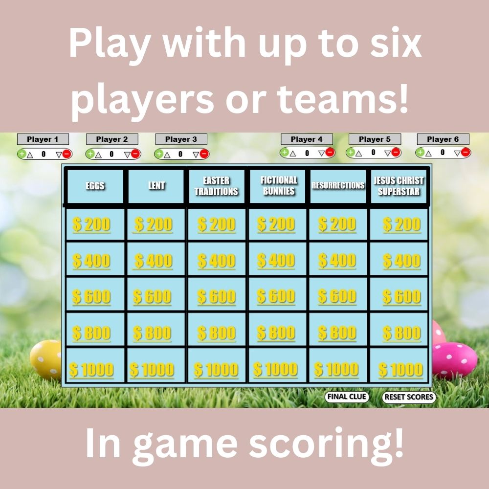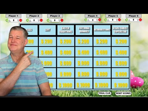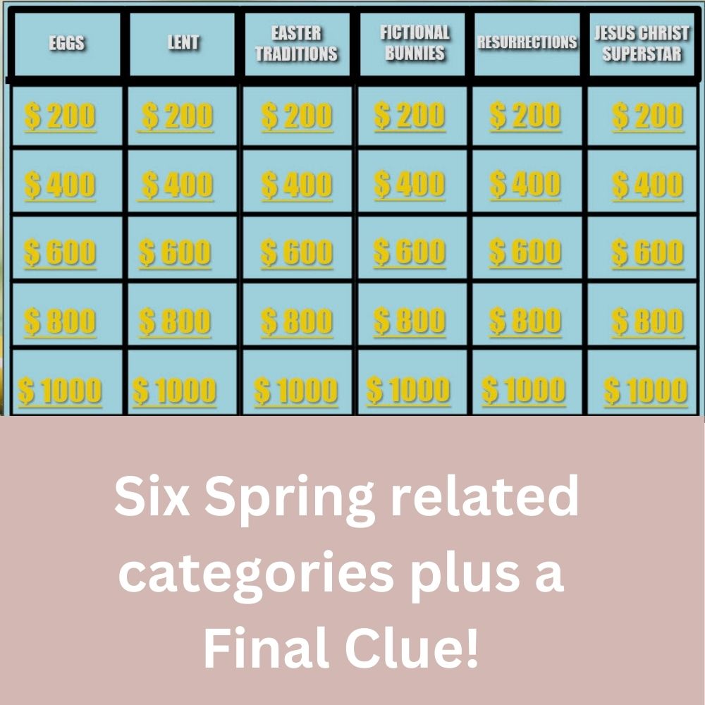 - Six Easter related categories with five clues and answers each (Eggs, Lent, Easter Traditions, Fictional Bunnies, Resurrections, Jesus Christ Superstar)