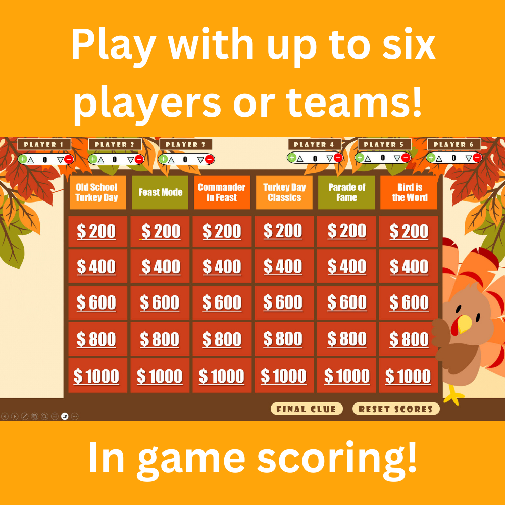 Perfect for classrooms, parties, or team-building events, JParty: Thanksgiving Edition brings all the excitement of the classic game show with a holiday twist. Easy to play and simple to set up, this PowerPoint game is sure to make your Thanksgiving unforgettable. Are you ready to test your Thanksgiving knowledge?