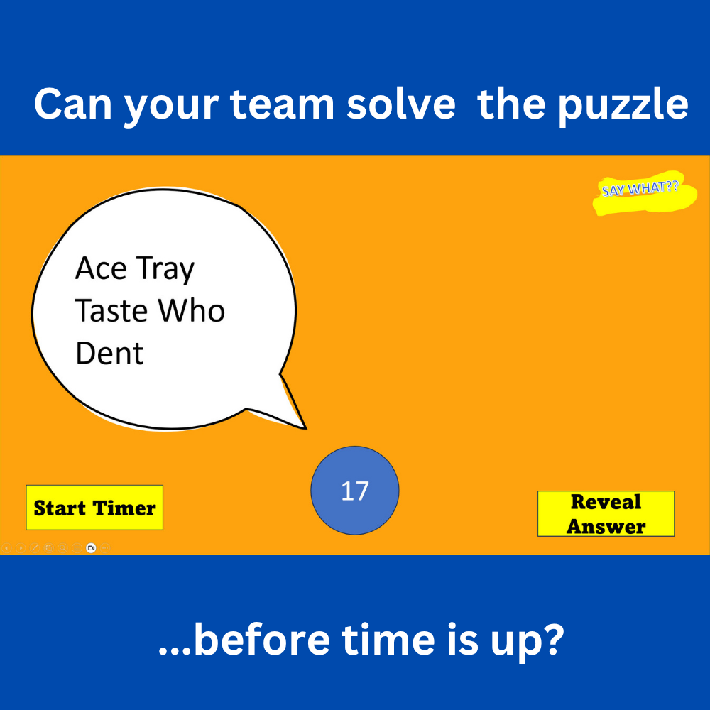 A fully customizable PowerPoint presentation with 50 unique puzzles ready to play. Simply project on a screen and watch as players race to decode the gibberish phrases. No preparation needed—just open and play!