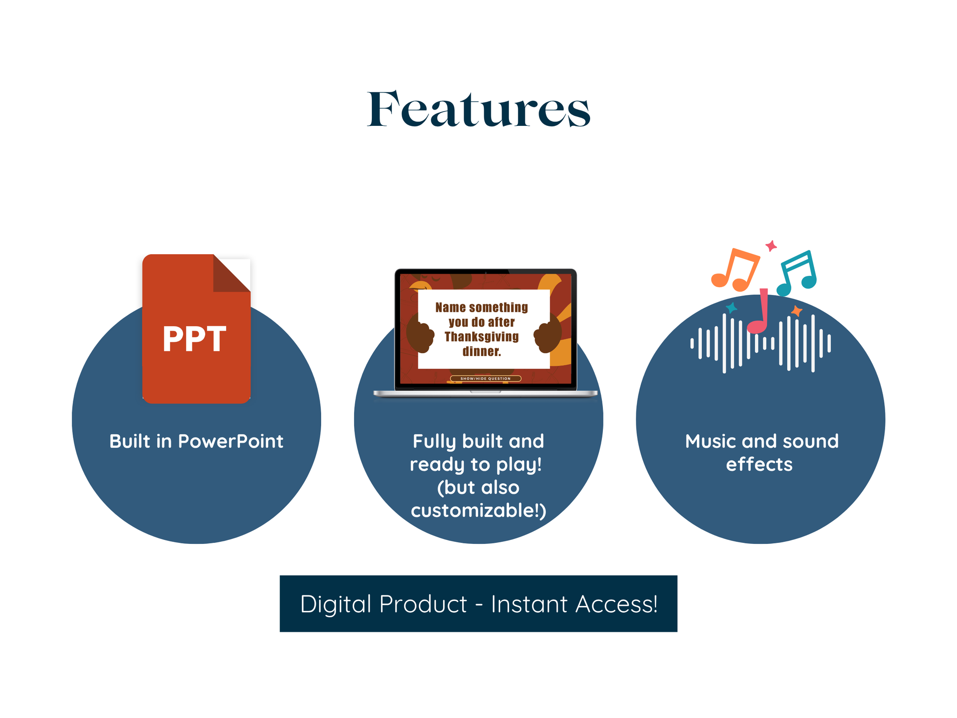 - Thanksgiving Feud - Full Game Version: Bring the excitement of the classic Family Feud game to your Thanksgiving gathering! Test your knowledge of Thanksgiving traditions, turkey trivia, and holiday favorites in this interactive party game.