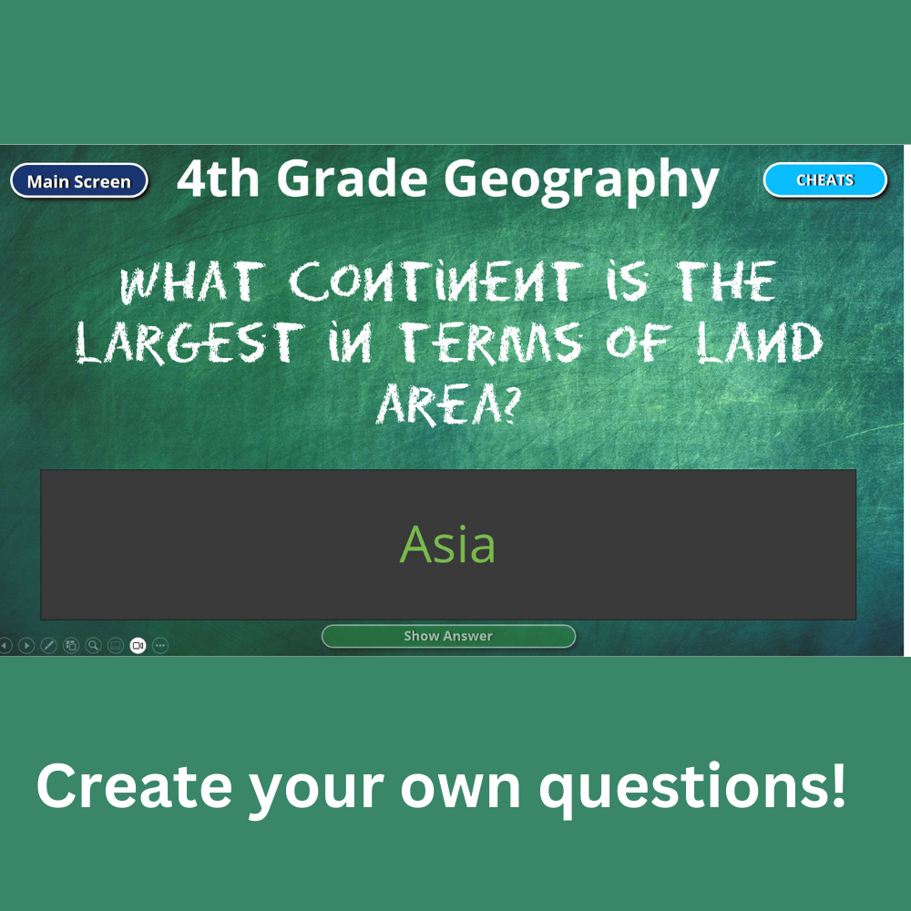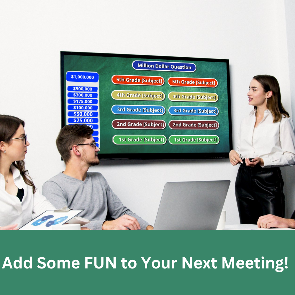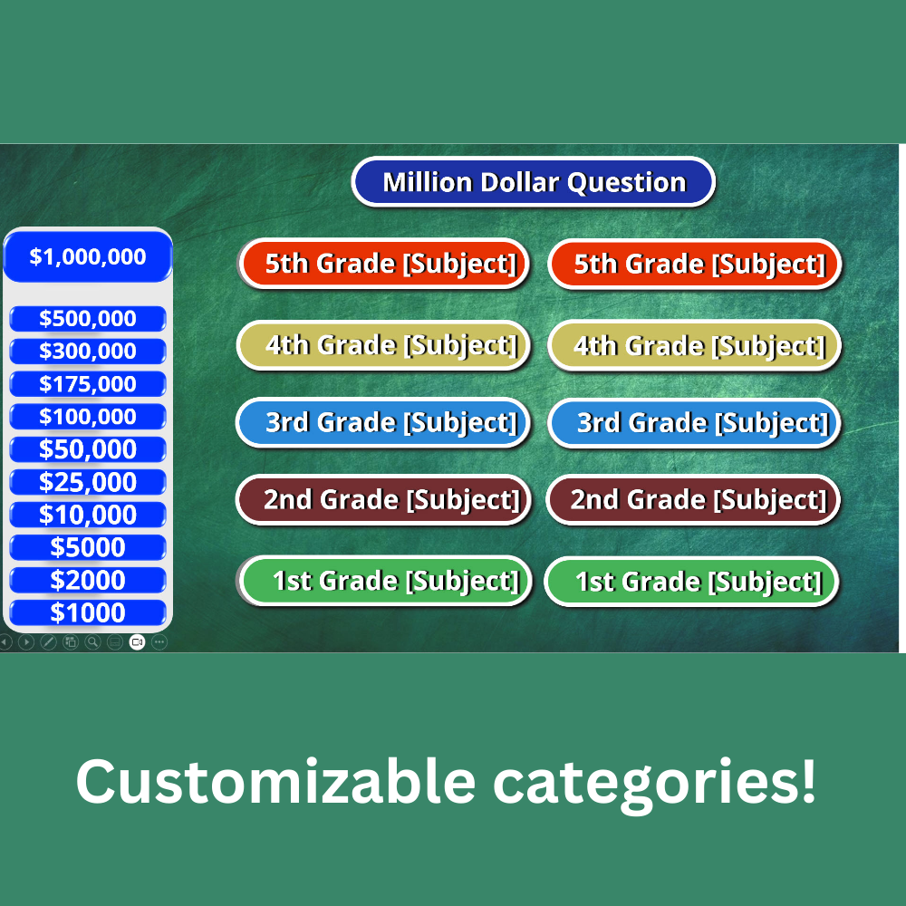 With a clean, colorful design and intuitive navigation, the Who’s Smarter? template is the perfect way to spark excitement and participation in any setting—be it a classroom, family gathering, or virtual team-building event. Simply add your own questions and answers to the pre-built slides and put it into Slide Show mode. Players or teams take turns selecting grade-level categories and answering questions to earn money.